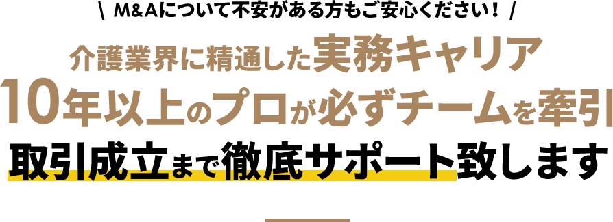 経営承継支援では、介護業界専任チームの”M&Aのプロフェショナル”が貴社専属チームを率いて、初期相談時からM&A戦略・実行案を提案します。