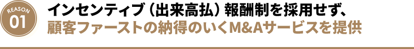 多くのM&A仲介他社が採用しているコンサルタントのインセンティブ=出来高払報酬制のもとではM&Aの成約が担当コンサルタントの収入に直結するため、大きな案件を短期間で成約させる、というインセンティブが強く働き、お客様本意ではないアドバイスになりがちです。