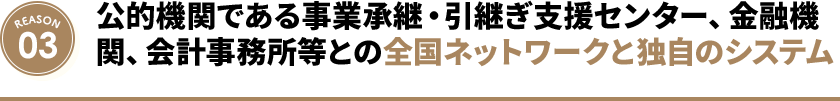 提携金融機関や会計事務所、事業承継引継ぎセンターのネットワークを構築していますので、地域を問わず、全国対応が可能となります。